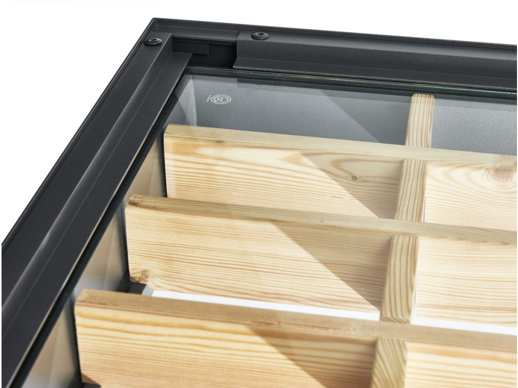 materiál | práškově lakovaný hliník tl. 2,5 mm jedlové dřevo čiré bezpečnostní VSG sklo tl. 8 mm |