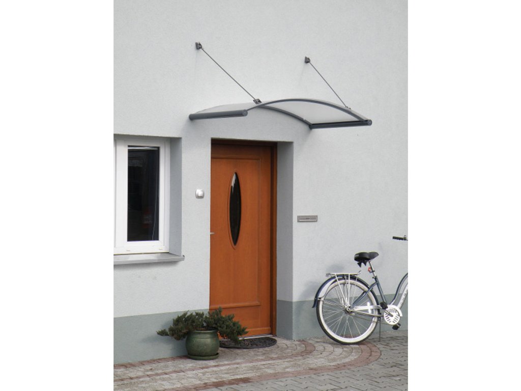 Půlkulatá exkluzivní vchodová stříška vyrobená z vytlačovaného akrylového skla a hliníkových profilů. Stříšky nad vchodové dveře RONDO GLASS jsou vhodné pro zastřešení vchodů, balkonů, výloh obchodů nebo například pro zastřešení nad bankomaty.